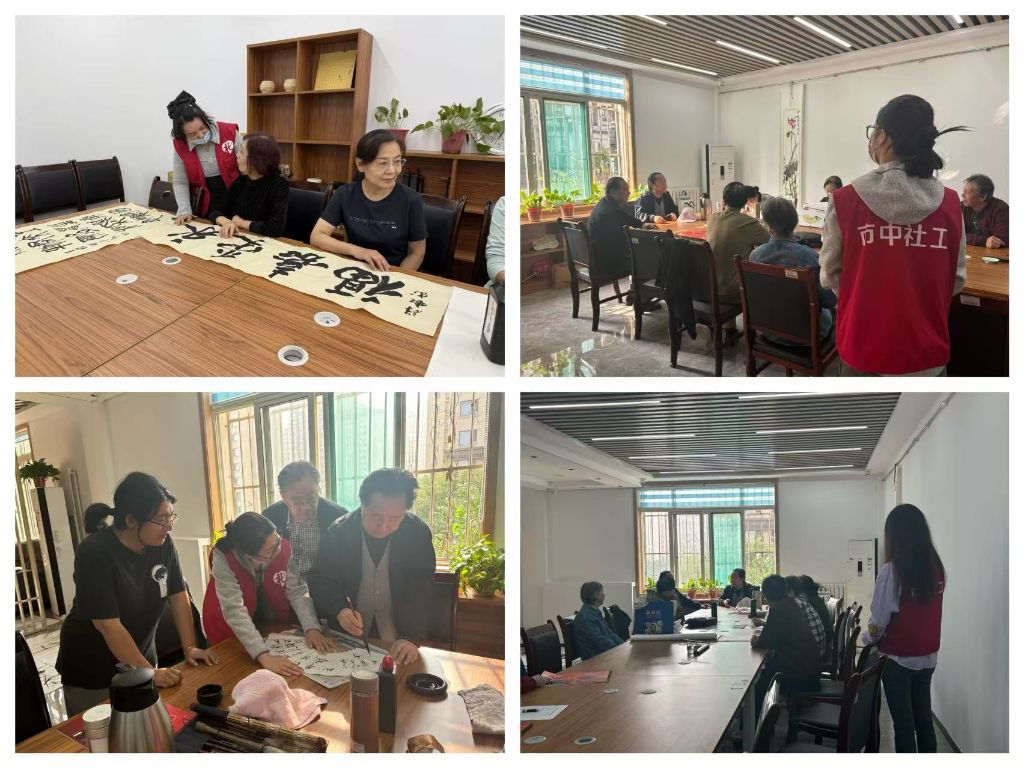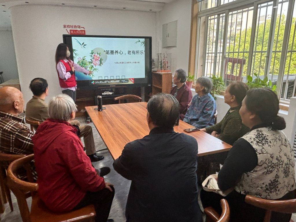 为丰富辖区退休居民的业余文化生活,促进居民之间的交流沟通,激发书画兴趣爱好,七里山街道社工站积极响应居民在艺术修养与审美情趣提升方面的需求,组织对书画有浓厚兴趣的退休居民,指导成立“笔墨养心 老有所乐”老年书画兴趣小组。小组邀请了社区书画达人担任组长,促进公益资源在社区流动,提升社区凝聚力,推动社区文化高质量发展。