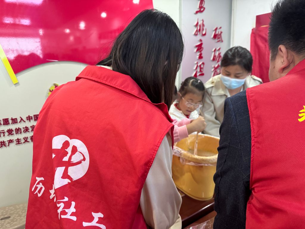 在了解了漆扇的基本知识后,亲子家庭们迫不及待地开始了制作环节。在社工和志愿者的悉心指导下,家长和孩子们共同拿起工具,从调漆试色到扇面绘制,每一步都凝聚着家庭成员的共同努力与智慧。孩子们在家长的陪伴下,不仅学会了基本的制作技巧,更在过程中感受到了传统文化的独特魅力,体会到了劳动的乐趣和成就感。