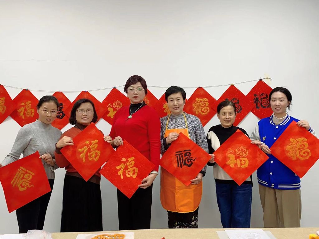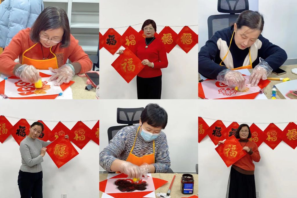 活动正式开始,本节活动以拓印新春福字为主题。社工首先向组员们仔细介绍拓印的一般流程及相关工具的使用方法,介绍完毕后演示详细操作方法。组员们将红色斗方宣纸铺平,把模板对准图案,调整好角度,然后用海绵刷把金墨或黑墨涂在凹凸不平的图案上,静候片刻待墨迹晾干一幅福字就完成了。拓印过程中,组员们互相分享自己的拓印技巧,梁老师注意到李老师的杯套问道“李老师,这是你自己织的吗?”“没错,自从咱学习了钩织我就回家自学了很多,还学会了钩小发卡”李老师开心地对大家说道。组员在现场热闹的氛围中完成了一幅幅精美的拓印作品,并一一进行作品展示。活动最后,组员们纷纷打卡拍照,大家一起合照留念,留下了本次活动的珍贵回忆。