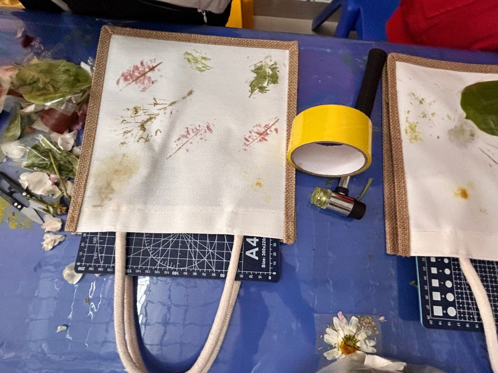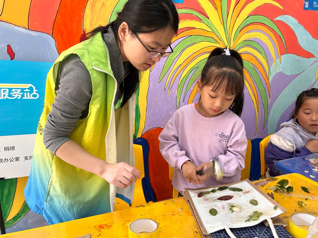 “最是一年春好处,绝胜烟柳满皇都”,阳光明媚的春光不仅是踏青游玩的好时候,还是亲近大自然、体验花红柳绿的绝佳时机。孩子们早早就准备好了各种各种的新鲜花叶,开始非遗植物敲拓染手提袋环节。社工先向孩子们介绍了植物敲拓染的非遗历史和技术要点,然后亲自示范制作步骤。孩子们也在社工的指导下,认真挑选植物,仔细敲打,用心染色。“咚咚咚”,耳旁尽是孩子们卖力的敲打声。经过一番努力,一个个独具特色的手提袋终于制作完成。这些手提袋有的色彩斑斓,有的图案独特,每一个都充满了孩子们的个性和创意。他们拿着自己的作品,脸上洋溢着自豪和满足的笑容。
