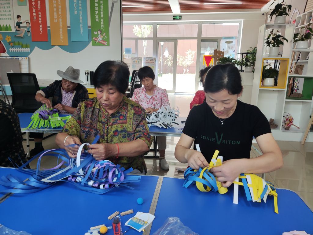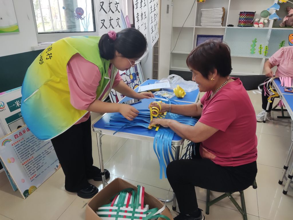 活动现场,大家其乐融融,在社工耐心的引导与教学下,许多起初对自己信心略有不足的服务对象勇敢迈出编织第一步,复杂的步骤在社工耐心的讲解下逐渐明晰,鲜艳的编织条带在大家认真的制作下渐渐成型。在编织过程中,社工以“拉家常”的方式,拉近与服务对象的距离,在陪伴中挖掘服务对象潜能,鼓励服务对象正视晚年角色,引导服务对象建立积极、健康的老年价值观。