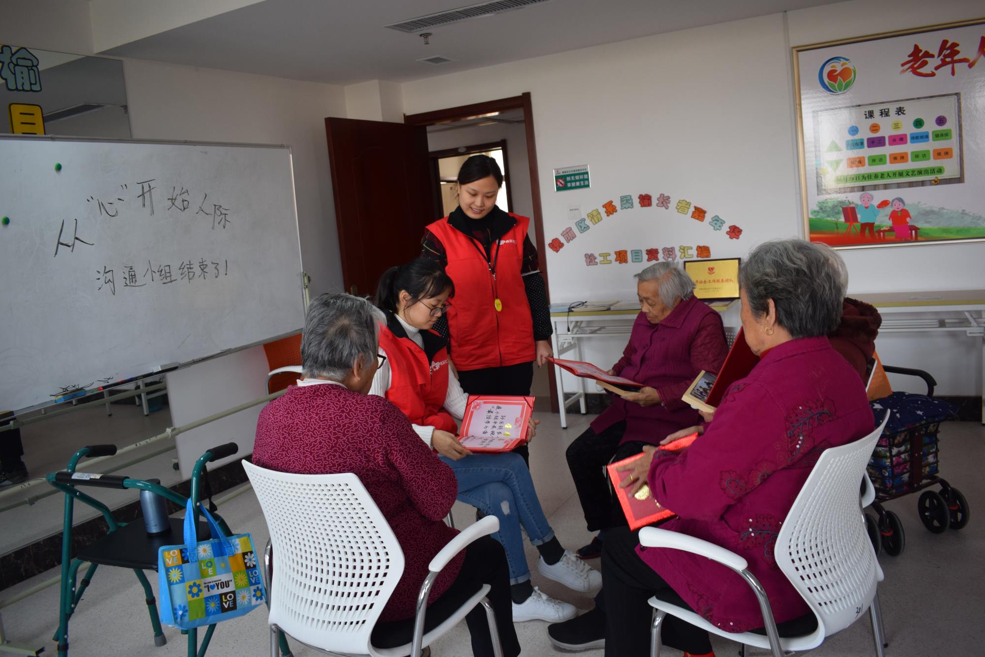为期八周的从“心”开始人际沟通小组在今天正式结案了,一路走来,服务对象从开始的不理解“这个小组到底是干什么的?”转变为现在的“这个小组真好啊,希望有第二期!”。服务对象的肯定给予社工极大的信心,准备开展第二期活动,服务更多老人。11月1日,众诚悦银龄养老社工项目组在福利中心三楼老年大学开展了从“心”开始人际沟通小组的第八节小组活动“海内存知己,天涯若比邻”。