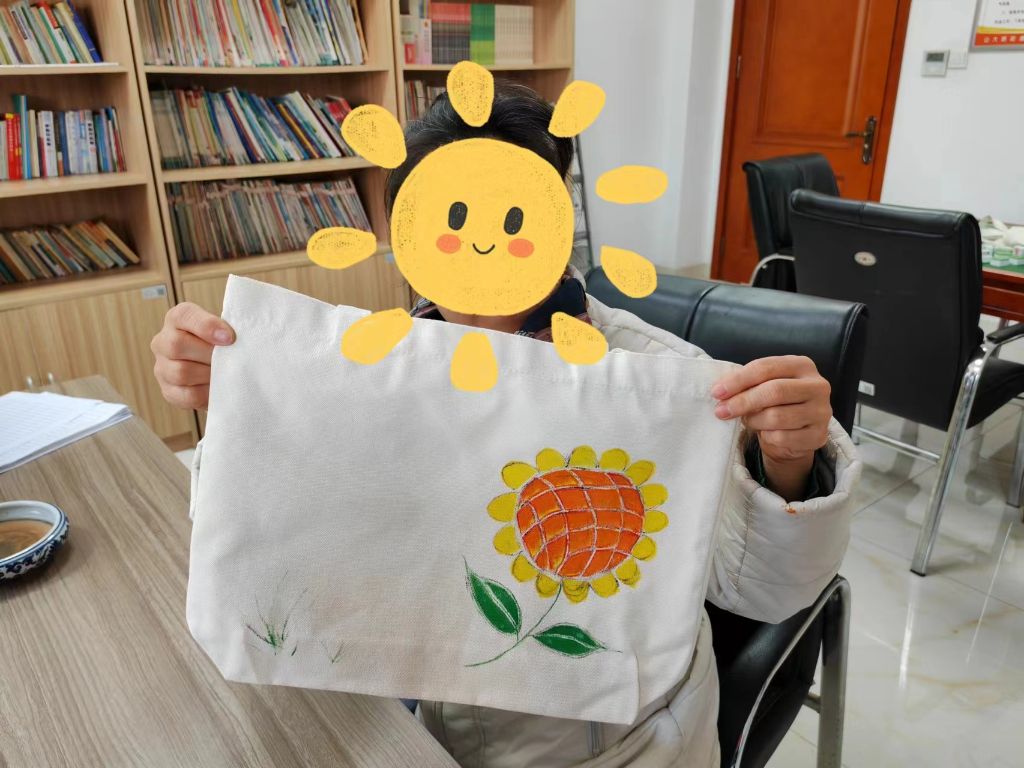 活动中李爷爷拿着笔迟迟不下手,社工察觉询问后,李爷爷回答说:“画不好这个包不就浪费了,我之前是画图纸的。”社工明白李爷爷的顾虑,并迅速给予李爷爷鼓励,以提升他的自信心。尽管他们均为身体残障者,但他们的想象力是无边无际的,他们对于周围的环境,有着独特的看法和情感。最后,他们中的一些人开始根据自己的创意进行创作,而另一些人则根据预先准备好的图案进行模仿和上色。他们使用绘图笔绘制图案的边缘,并用丙烯颜料混合不同深浅的手绘配色,然后上色。这些五彩斑斓的色彩在帆布包上绽放,最终形成了一幅背靠在身上的装饰画,一只只具有独特风格的帆布包便制作完成了。活动结束后,师阿姨讲道:“真的挺不错的,我以后出门就背着它,这可是独一份啊!”