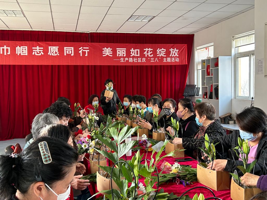 最美不过三月天,花开成海,春意盎然。为庆祝“三八”国际妇女节,丰富社区妇女群众的精神文化生活,提升居民的审美修养。北坦街道社工站联合生产路社区开展“与花相伴 绽放芳华”插花活动。