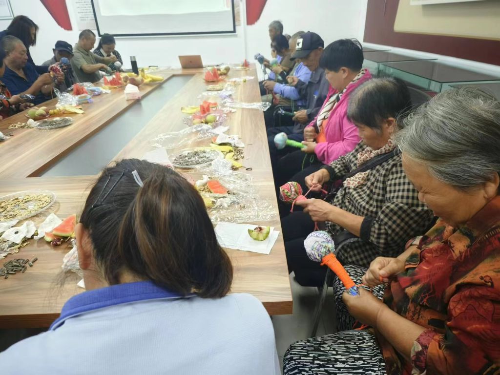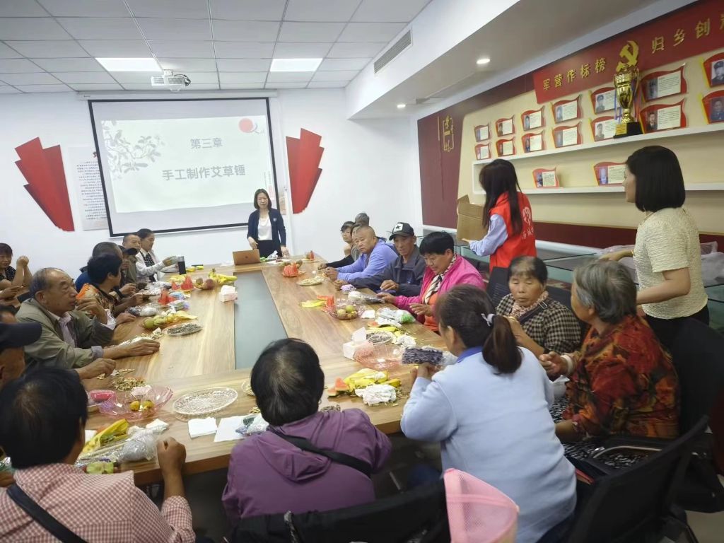 社工还准备了各种有趣的手工材料,包括彩色粗布、艾草、棉花、锤柄、麻绳、皮筋等。社工一边向大家讲解艾草锤的功效和作用,一边教授大家制作属于自己的秋季养生好物。老人们跟随社工的节奏,将蓝色粗布平摊在桌面,艾草粉末倒入粗布正中间,捏成一个紧实的圆团……在轻松愉快的氛围中,一个个形似话筒的养生锤便制作完成了。“制作好的艾草锤散发着淡淡的艾草药香,有宁神理气、驱蚊驱虫的作用,用它轻轻敲打身体部位,可以疏通经络,加快血液循环。”老人们开心的说道。 大家迫不及待拿起亲手制作的养生锤开始捶打肩颈、后背、关节等部位。“这个艾草锤打在后背上太舒服了,还有一股艾草的清香,闻起来神清气爽,挺好!”居民张阿姨笑着说,回家也要用它帮老伴敲敲后背。