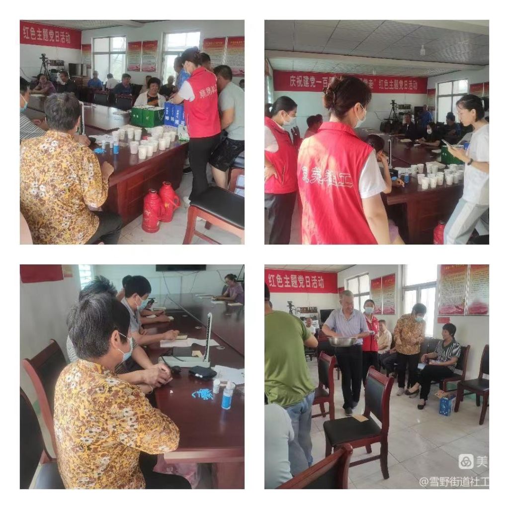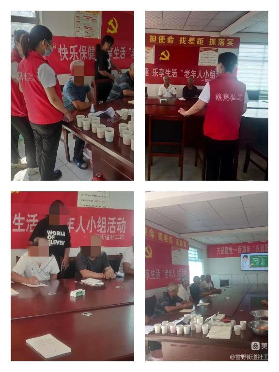 活动当天,雪野街道社工站邀请站点发展到的小志愿者来到活动现场,协助社工站一起开展活动。根据村内筛选的亚健康老年人,社工站邀请村内医务室医务人员对老人进行血压、血糖的检测,并根据检测的数据,社工站筛选出9名老年人,组成老年人教育小组,小志愿者帮助社工站为组员们进行签到登记后,社工站为组员们播放视频,并讲解常见的慢性病的预防与管理知识,让组员们对慢性病有一个基础的认识。