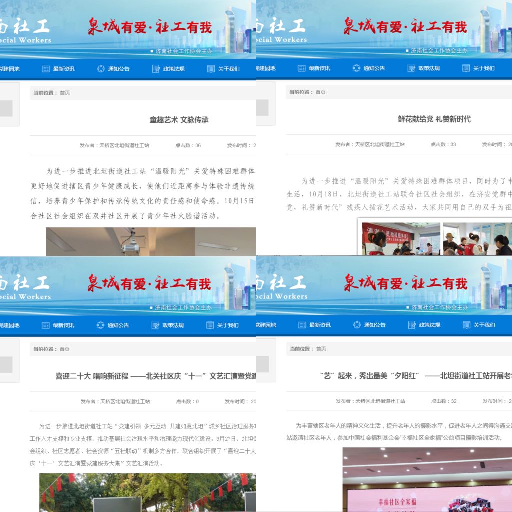 2、北坦街道社工站宣传报道共发布37篇新闻稿,其中济南社工官网26篇,山东省社会工作协会1篇,其他媒体2篇。北坦街道社工站通过媒体等公众平台扩大宣传,让更多的社会大众了解社工站。