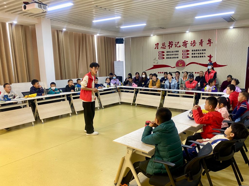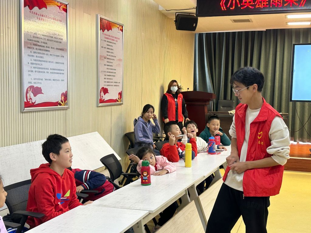 活动在志愿者老师讲述《小英雄雨来》的红色故事中拉来帷幕,孩子们跟随绘本阅读,认识到了峥嵘岁月中的少年英雄,感受到了烽火硝烟的勇气和智慧。随后的“小剧场”环节颇为有趣,社工让孩子们自主选择表演角色,各位小小表演家跃跃欲试、通力合作,将活泼勇敢的“雨来”、坚毅朴实的“李大叔”、狡猾可恨的“日本军官”等人物带到了观众眼前。