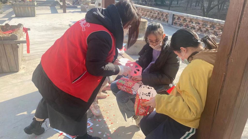 在花灯制作环节,社工们指导孩子们动手制作花灯。孩子们迫不及待地打开材料包,按照步骤拼接,不一会儿,一个个透露着喜庆的12生肖灯笼制作完成,孩子们都非常兴奋,脸上洋溢着大大的满足。