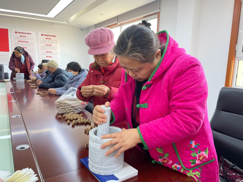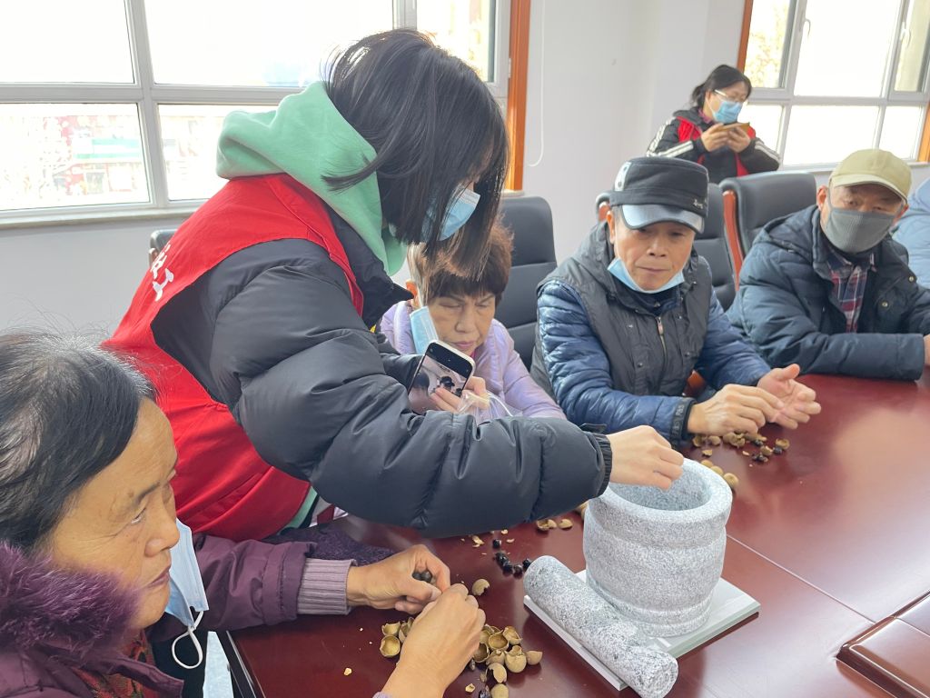 活动现场,社工链接的志愿者李老师为居民们讲解冬季养生的方法,帮助居民有效防范冬季疾病带来的困扰。在随后的手工制作环节,社工为居民准备制作脐贴所需的材料,并向居民讲解制作脐贴的步骤。居民们按照社工的讲解将桂圆肉、花椒、艾绒等中药材按照一定比例混合搅拌,然后用手捏出一个个小球,用保鲜膜包好保存。活动最后,社工倡议大家将做好的脐贴送到不便出门的老人家中,将健康温暖传递。