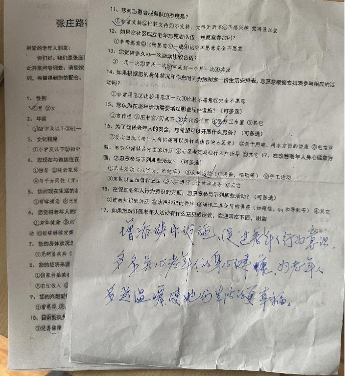 社工鼓励居民积极参与问卷调查,建言献策,社区居民踊跃参与。社区书记作为服务居民日常工作的第一责任人,掌握着社区第一手资料。社工站以此为切入点,运用访谈法与社区书记进行面对面交流,明确了社区的需求与期待。调研结束后,社工认真整理调查问卷,明确群众诉求,并结合群众关心的问题,研究并分析了社工在社区服务中的优势和不足,进一步确定服务方向,为新的项目合作奠定了基础。
