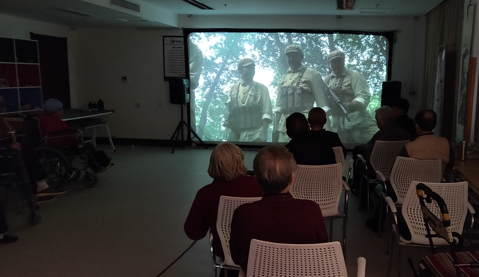 通过前期调研,社工了解到福利中心的住养老人中有几位是曾经参加过战斗的退伍或退休军人,在访谈中,他们不止一次谈到过那段弥漫着硝烟战火的峥嵘岁月,混杂着怀念、向往的神情令人动容。利用每月的公益电影放映机会,社工链接了放映人李老师,请他挑选一部解放战争时期的电影为老人放映,使老人能够重温那段激情岁月,找回对生命的热情。4月22日,电影放映活动在福利中心三楼老年大学如期开展。