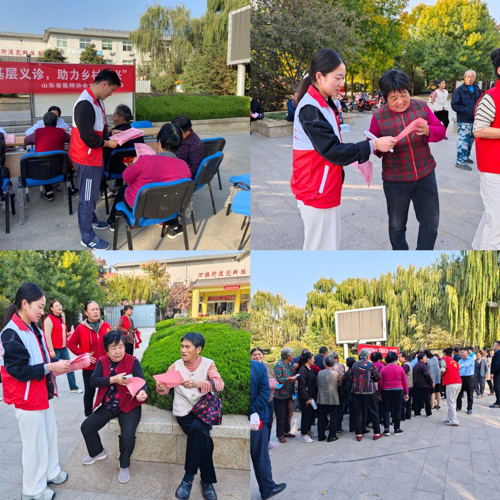 为把优质医疗资源送到群众家门口,为群众看病就医创造便利条件,万德街道社工站协助万德街道开展义诊活动。来自山东大学齐鲁医院专家团队现场为居民群众把脉问诊,耐心解答患者疑问,医务人员为社区居民提供免费测量血压、血糖等服务,详细讲解高血压、糖尿病、冠心病等常见慢性疾病和并发症的危害,叮嘱患有基础疾病的老年人要合理膳食、均衡营养、适度锻炼、定期体检,养成良好的生活习惯。