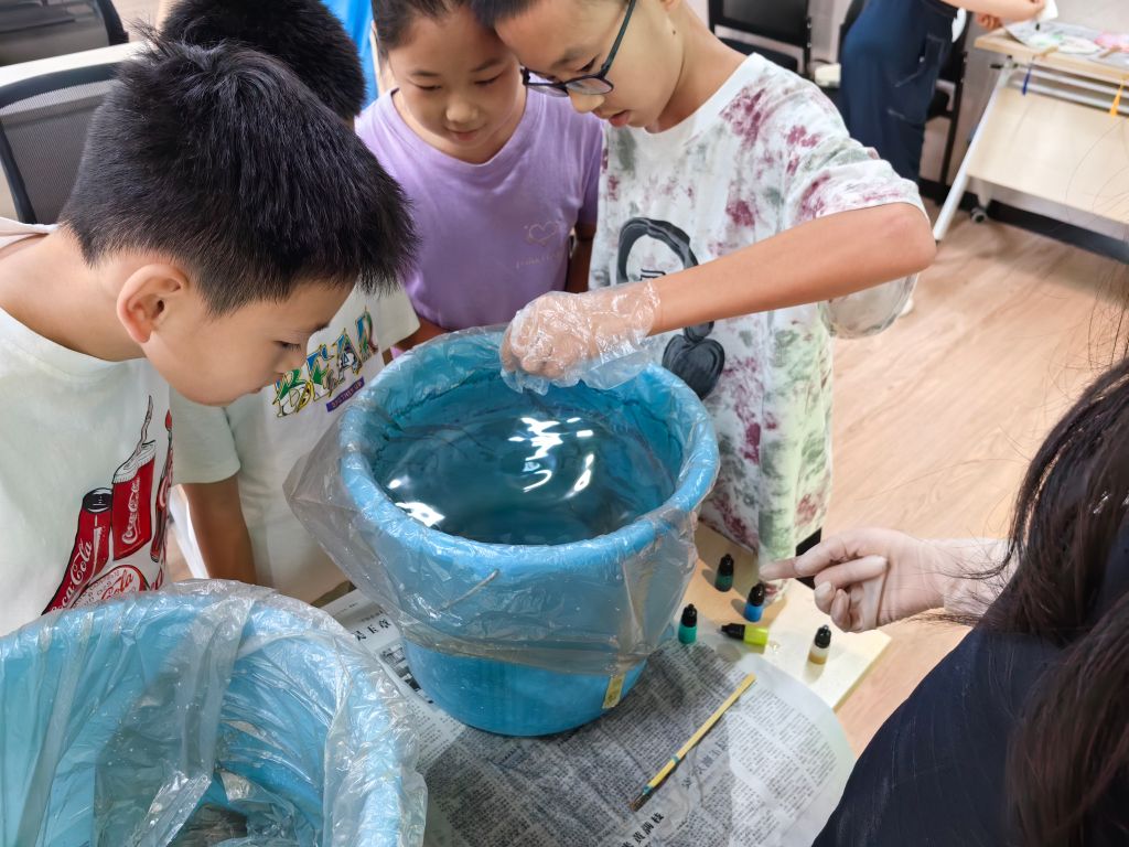 在制作过程中,每位参与者精心挑选漆料,随后他们巧妙地将漆液轻轻滴洒于平静的水面之上,宛如星辰落入夜空。运用调色棒,他们以艺术家的笔触,在水面上勾勒出一幅幅独一无二的图案,每一笔都蕴含着创意与匠心。随后,团扇被温柔地置于这幅流动的画布之下,大漆随水波的轻抚自然依附于扇面,水流的轨迹与漆色的交融,形成了一幅幅流动的诗篇,色彩交织间,仿佛流云悠然,意境深远,充满了古典的诗情画意。