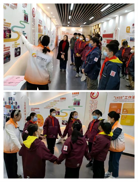 活动中,社工站社工首先从社工站的整体运营模式开始讲起,对社工站的“四库全书”、功能布局进行了详细解说。同时从社工站的的特色服务活动着手结合皮亚杰的心理认知发展理论,鼓励少先队员们参加社区垃圾分类、志愿服务等公益活动,激励先锋队队员们以更强的责任感和使命感为红领巾争光添彩。为了帮助青少年体验团队合作重要性,展现社工服务的活动特色结合青少年年龄特点,社工站社工带领他们进行了“心有千千结”游戏。活动最后,少先队员们手持五角星,在光荣的少先队旗下合影,灿烂的笑容展现出新时代少先队员的良好风貌。