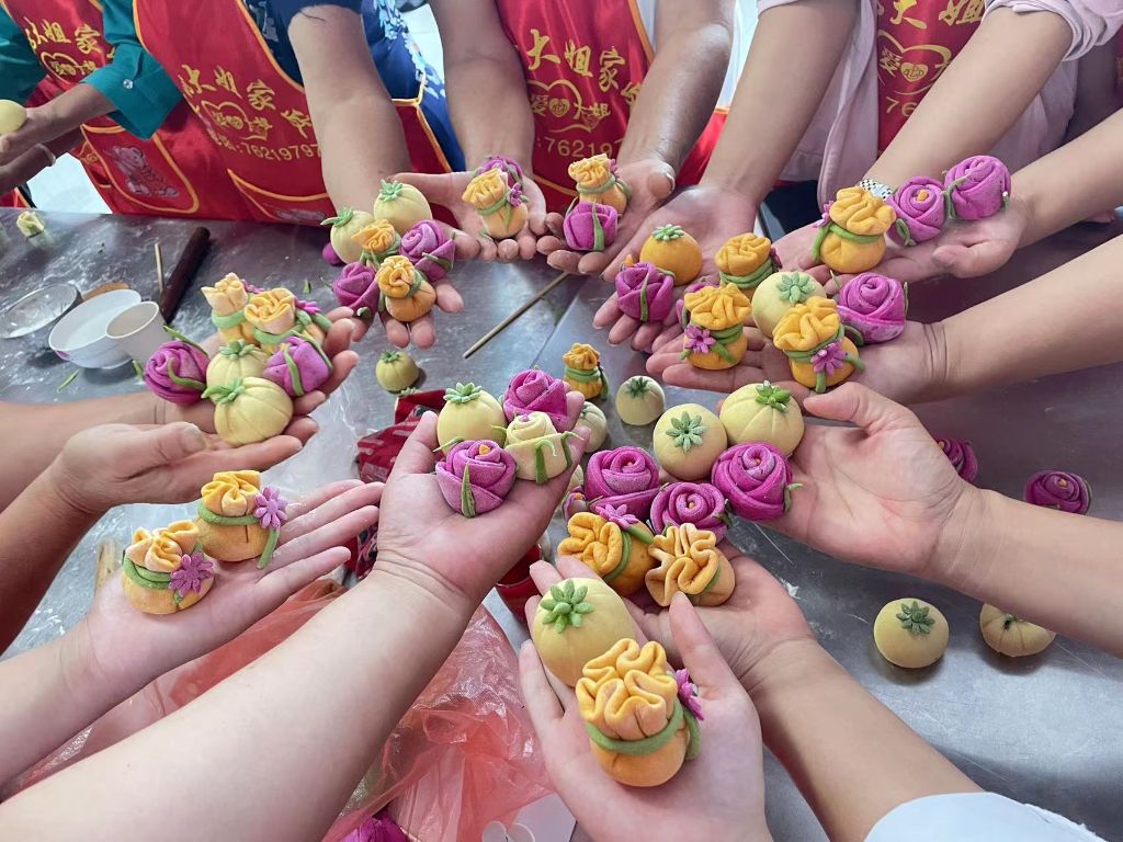 课堂上,老师们授课内容丰富接地气,讲解通俗易懂、实操演示规范,努力让所有人当场吸收。主要是讲了面食的花样做法,和收纳规整。参加的阿姨们也都全身心地投入到学习中,积极动手参加实操训练,并虚心向老师和其他姐妹学习请教,并表示希望能够学会做给家里小孩吃,即营养全面又干净卫生还实惠。很快阿姨们做出了玫瑰花、南瓜、福袋样式的面食。家政培训仍在继续,社工服务永不停歇。我们社工站将以此次培训为契机,一贯践行“我为群众办实事”,不断激发农村妇女的生活乐趣,接地气的让她们学到更多。