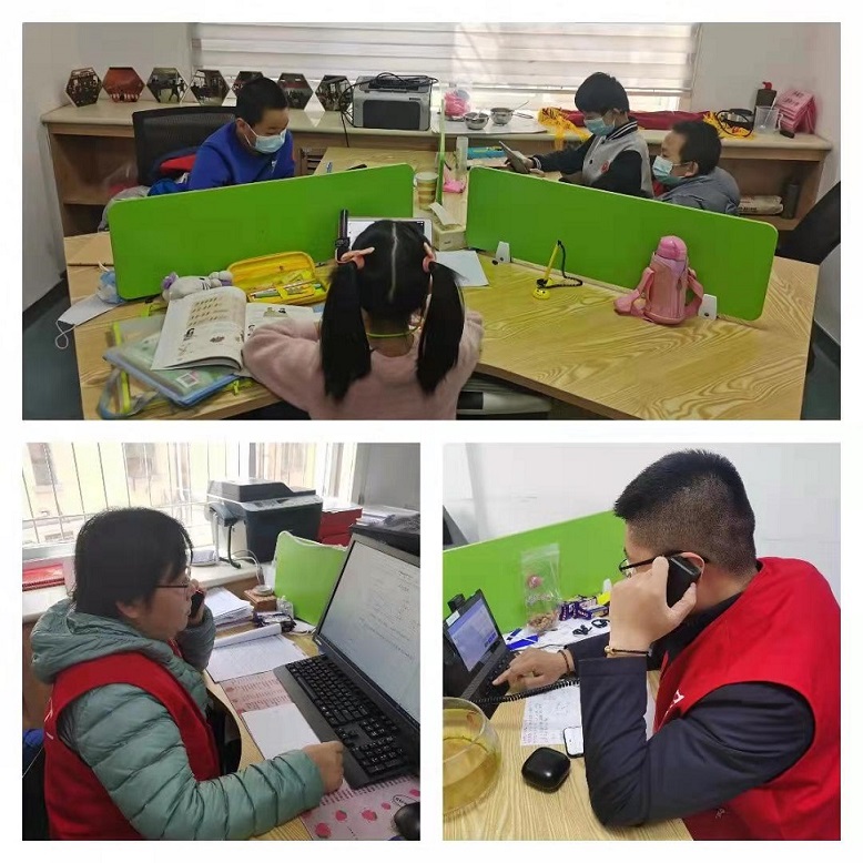 社工还收到多个电话求助,了解到辖区多名双职工家庭的家长不会网络操作了,没有时间在家陪伴孩子线上学习等种种问题,为了帮助解决家长的困难,社工站提供场地,让几名双职工家庭的孩子来到社工站进行线上学习,这样便有效解决了家长们时间冲突的问题。同时,社工为孩子们按照年级分配了不同的房间,一方面有助于共学互助,另一方面也是防止聚集。孩子们在社工的管理下全程带好口罩,在线上课程中,孩子们遇到的学习问题社工也都一一解答。