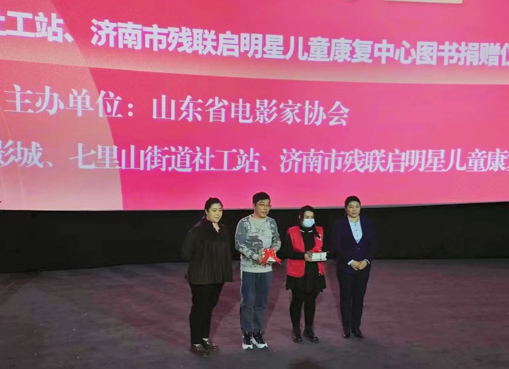 活动由辖区热心党员傅大爷主持,第一个环节是启明星儿童康复中心闫老师为大家带来一节特殊的课,老师讲述了职业生涯中的几个小故事,以自身的亲身经历感染大家,现场观众纷纷鼓掌。第二个环节是公益捐赠与签约授牌仪式,由山东省电影家协会副秘书长徐芳、山东文旅集团影城有限公司副总经理刘荣开为七里山街道社工站、启明星儿童康复中心捐赠图书,济南市快乐一家社会工作服务中心为影城现场进行授牌并签订公益合作协议,随后主持人宣布仪式圆满完成,邀请大家一同观看《我本是高山》。
