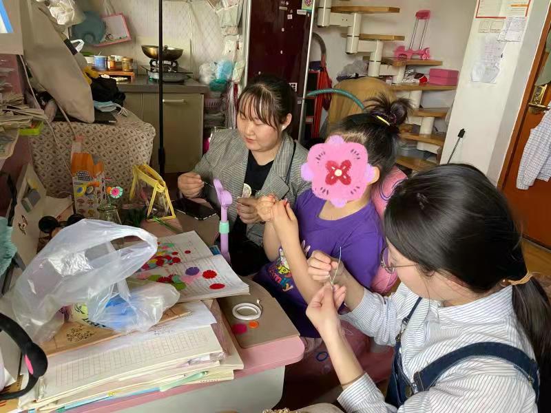 社工首先与困境儿童所在社区居委会取得联系,通过儿童主任了解到孩子及其家庭的基本情况。在探访过程中,社工与困境儿童监护人亲切交谈,仔细地了解家庭生活现状、听取他们存在的实际困难与需求点;与此同时社工与志愿者带领孩子一起制作手工作品,在制作过程中询问其朋辈群体、学习状况等。探访结束之际,小羽(化名)开心地说“谢谢姐姐们来陪我玩,陪我一起聊天”,并提出一起合影留念,记录这段美好的时光。