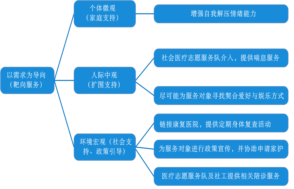 1.链接有利社会资源, 协助服务对象构建社会支持网络系统,为其提供健康医疗辅助服务及日常生活帮扶。社会工作者链接社会志愿组织, 对服务对象进行点对点帮扶, 社会组织志愿者会定期为服务对象上门测量血压、血糖和打扫卫生,促进其身体康复和减轻服务对象家属的生活压力。