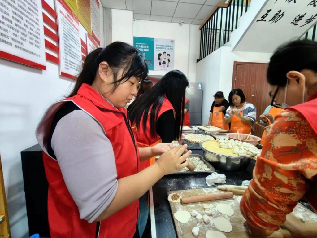 社工们一大早就到达清雅居社区居委会,为中午到来的老人们做起了午饭的准备工作,社工们齐心协力,有和面的,有调馅的,还有包饺子的,不一会儿一排排的水饺就被社工们包好了。