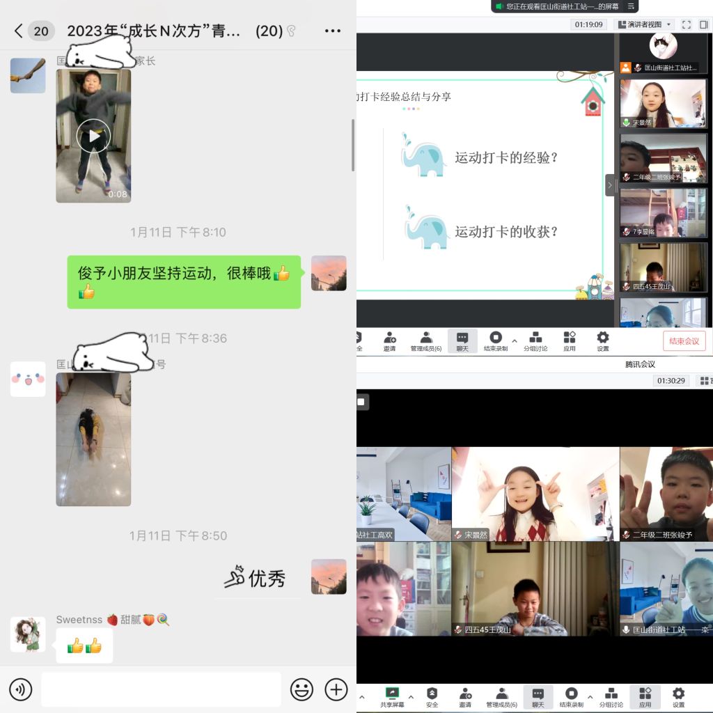 社工邀请营员线上运动打卡,即将运动视频、图片发在微信群内,社工根据打卡情况进行积分统计,统计完成后根据排名评选出运动达人,以此来促进营员运动习惯的养成。在打卡结束后的收获分享环节,营员们表示“运动使得身体素质和体能得到提升”“运动促进了免疫力提高,身体变得更加强壮”“运动使自己能够保持良好的体型,锻炼了身体的灵活性和协调性”。