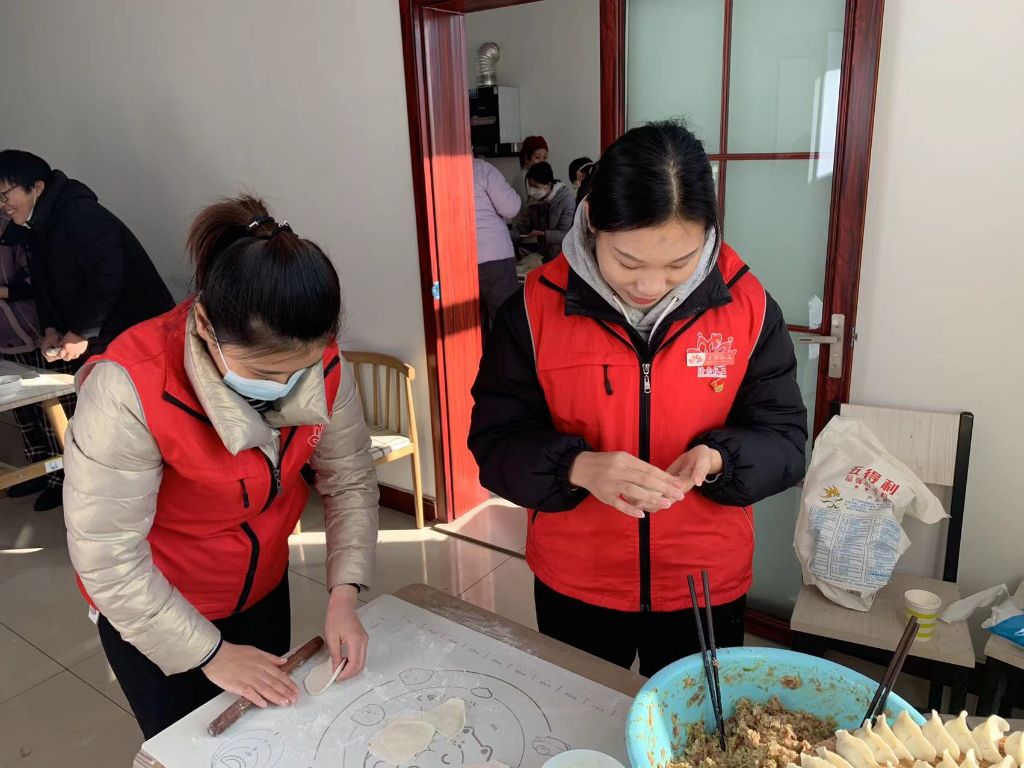 活动当天,凤城街道社工站的社工一大早就去超市购买新鲜食材送到社区里,社区里志愿者将食材一一清洗干净,大家齐聚一堂,分工合作,和面、擀皮、切菜、剁肉、调馅儿......大家边干边聊家常,不时分享包饺子的技巧和心得,人多力量大不一会的功夫饺子便包好了。