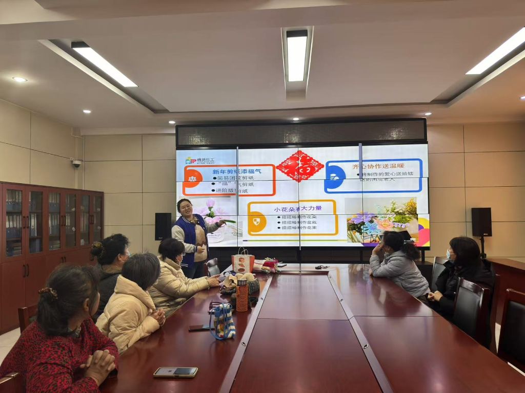 活动开展前,社工们通过深入的需求调查了解到,老人们希望在春节来临之际参与一些富有年味的活动。为了满足这一需求,“爱心造物社” 老年手工小组再次启航,共设置了三个板块:小花朵有大力量、新年剪纸添福气、齐心协作送温暖,旨在让老人们在动手创作的过程中感受传统节日的魅力,拓展老年人社会支持网络;同时传递爱心,温暖他人,让广大居民将目光聚焦到身边这些需要关怀的弱势群体身上,鼓励他们走出家门,融入社区大家庭。