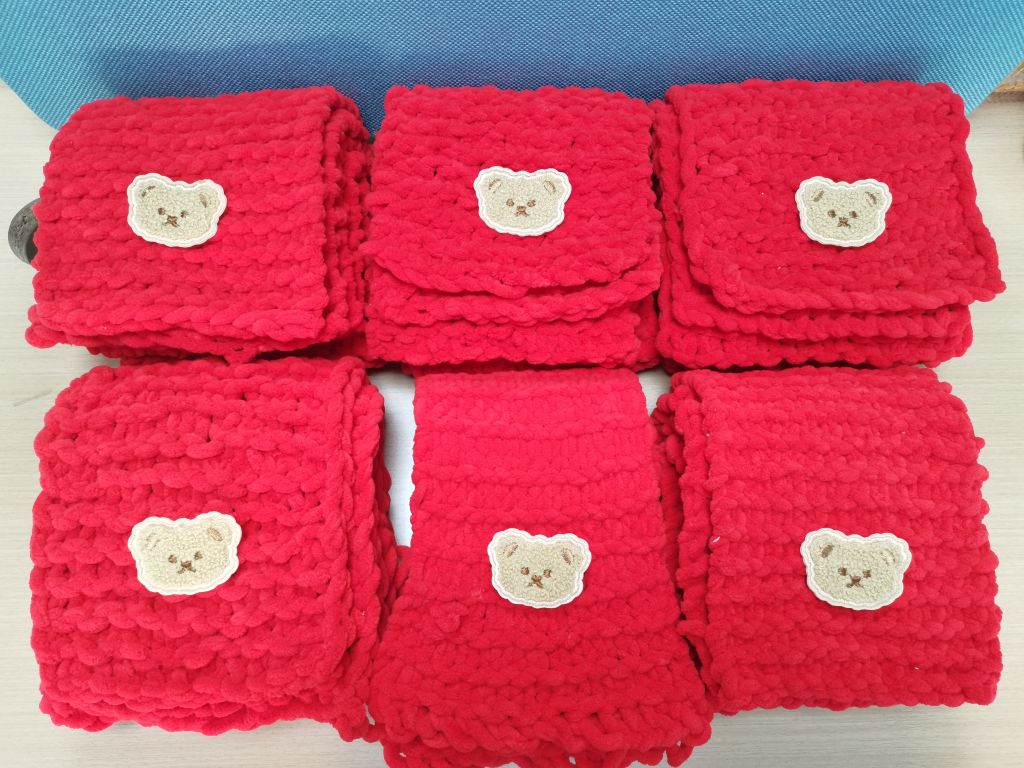 在编织过程中,社工与组员就“寻找年味”议题进行交流,得知本次小组产出的“中国红”爱心围巾将为辖区困境老人送去的时候,组员李阿姨情不自禁地说道:“那我们可得认真啦!”李阿姨诙谐的语气使得组员们纷纷开怀大笑,小组气氛和谐融洽。在大家认真仔细地编织里,红色的毛线团逐渐缩小,密密麻麻钩织成一条条温暖又独特,充满年味的“中国红”爱心围巾。