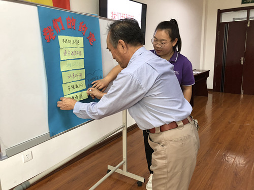 活动伊始,社工为组员介绍了活动的目的和意义,本次活动分为“你好,同学”、“课程介绍”、“我们的约定”、“合影留念”四个环节进行。“你好,同学”,社工通过“小中大暴雨”游戏环节设计,在愉快的游戏过程中小组成员相互认识,介绍自己的姓名和爱好;“课程介绍”社工以“PPT+讲解”的形式,向小组成员介绍这期电脑的学习课程内容的计划,使得小组成员对本次活动和社工有初步的了解,接着社工让小组成员组员填写服务档案和前测问卷,使得社工更快更全面的了解组员对电脑的认识和掌握的程度,开展有针对性的电脑课程;“我们的约定”,小组成员展开讨论,你一言我一语小组成员将小组规范写下来,一起贴在契约板上,相约成长;活动最后,社工用镜头记录下这美好的一刻。