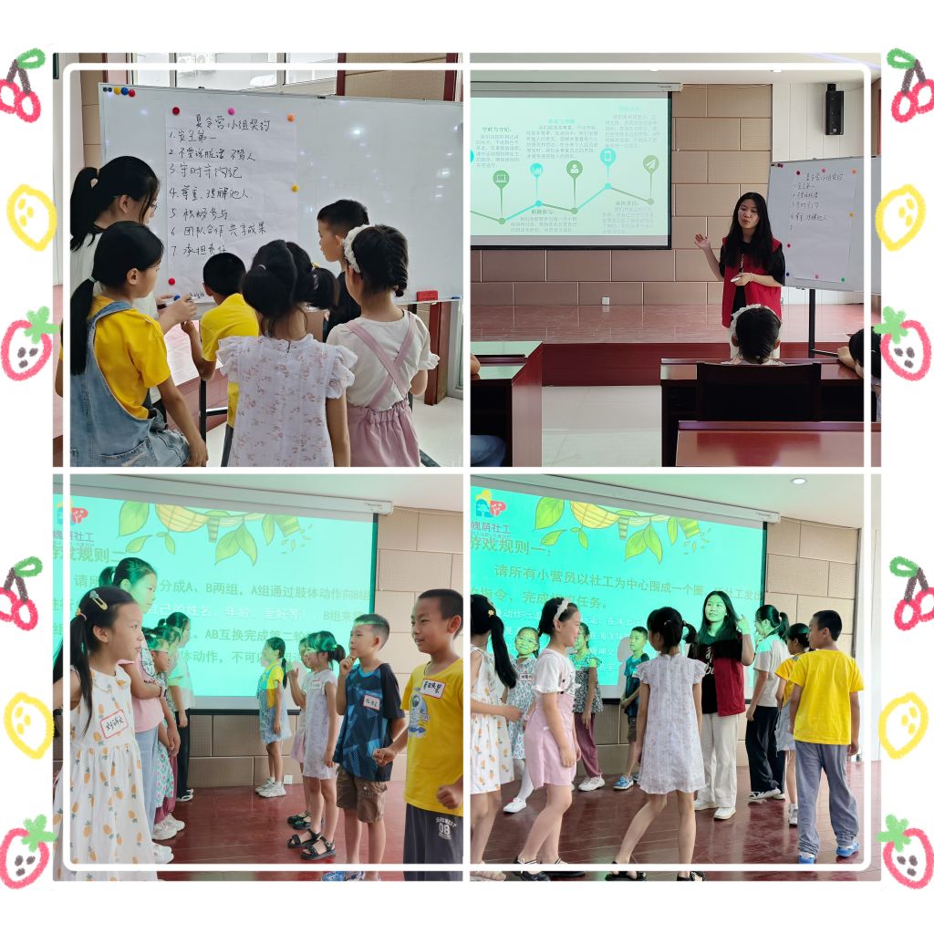 社工巧妙融入儿童戏剧元素,引领小营员们穿梭于“水中漫步”与“热沙行走”的挑战之间,轻松熟悉新环境。通过“握手”传递友好,“拥抱”加深情谊,小营员们逐步敞开心扉,用肢体语言进行自我介绍,在无声中初步建立了友谊。在此基础上,社工进一步引导小营员们共同参与制定小组契约,这是一份关于安全、尊重、合作与成长的共同约定。随后,社工和小营员们一起签下自己的名字,不仅是对契约的承诺,更是对未来共同学习与成长的坚定信念。