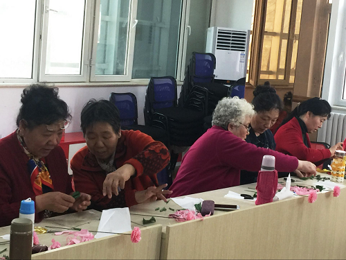 在社工的带领下,大家一起动起来,完成了一套简单有效的手指操后,老人们已经跃跃欲试地要开始制作了。分步骤,一步一步,老人们学的仔细又上心,一片一片花瓣,一枝一枝叶子,看着手中的材料渐渐变成一朵美丽的康乃馨,老人们脸上洋溢着满满的成就感。