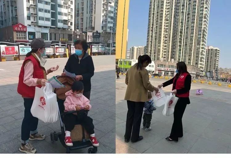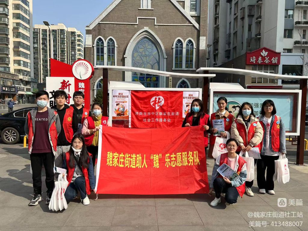 在活动现场,社工带领济南大学社会工作专业志愿者通过张贴海报、发放宣传单页、发放小礼品等方式宣传普及社会工作基本知识和各项服务,详细介绍了社工站的职能作用等。