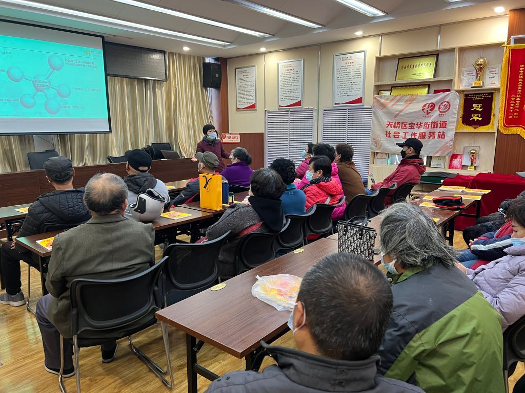 秉冬将至寒风萧瑟,冬季是老年人心血管疾病高发的季节,为降低老年人心血管疾病的发病率,提高老年人自我防护意识,宝华街街道社工站于11月17日开展冠心病预防和治疗知识讲座活动。