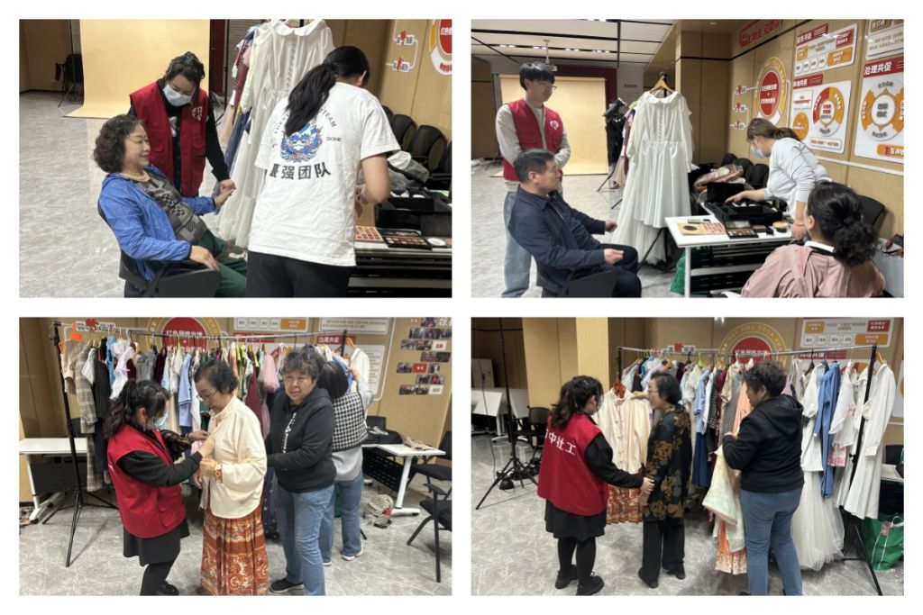 一大早,社工、志愿摄影团队就来到活动现场布置场地,带来了拍摄需要的衣服鞋子、化妆品、花篮阳伞等道具,将活动室变成一个临时摄影棚,静静等着老人们的到来。九点一到,张阿姨就来了,她在家中给自己打理好了发型,坐在化妆台前,张阿姨说自己好久没化妆了有点忐忑,社工也握住阿姨的手安抚她,让她放轻松。在另一边刘阿姨也带着家里人来了,社工带着她去挑选拍摄用的服装,选中了一套马面裙搭配粉色簪花,等化完妆换上服装大家都纷纷夸赞她真美,刘阿姨说“我已经不是爱美的年纪了,也只有你们还关心我们美不美,你们真好。”每一位叔叔阿姨换好服装出来,大家都不约而同的用赞美打消他们心底的不安,现场氛围一片祥和。