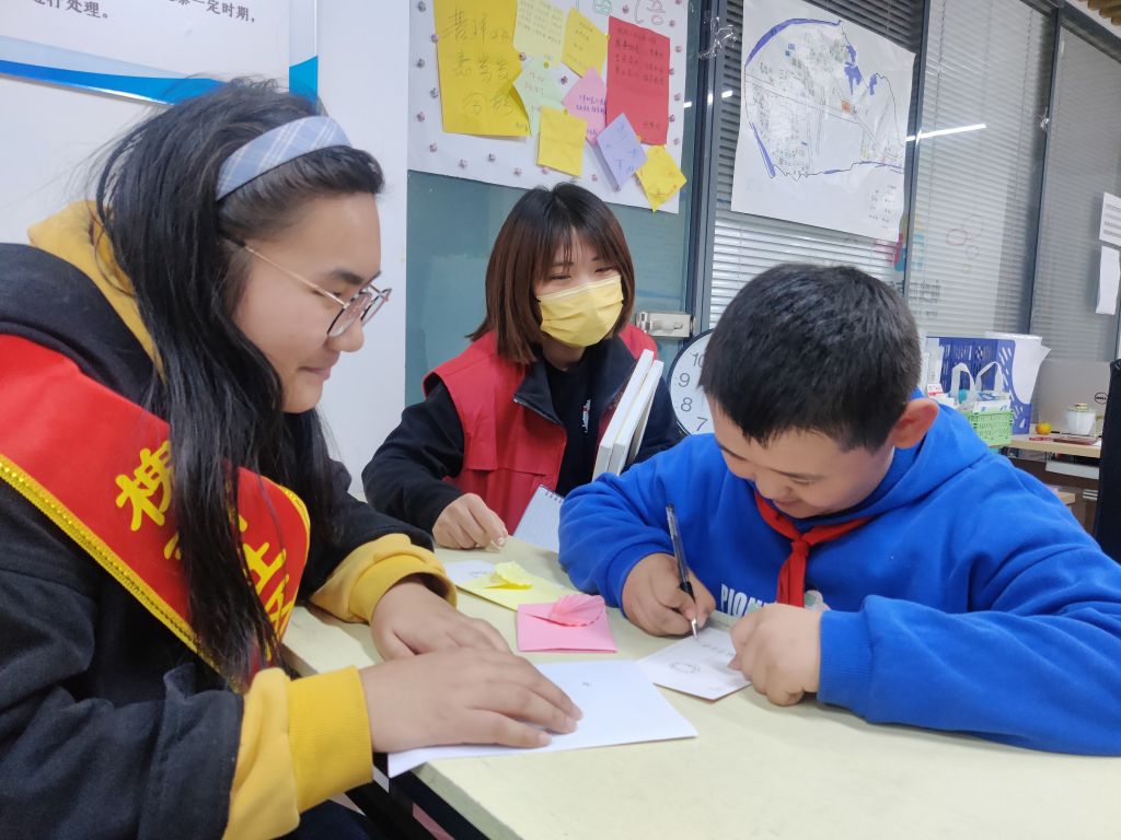 中华民族历来就有扶贫济困、助人为乐传统美德,我国古代思想家讲到,“老吾老以及人之老幼吾幼,以及人之幼”、“勿以善小而不为,以恶小而为之”。通过前期调研结果分析,结合困境家庭照护者实际需求,社工组织社区儿童志愿者、大学生志愿者进行焦点小组访谈,针对“我可以为困境家庭照护者做什么?”展开经验分享和服务活动方案讨论。期间,志愿者们各抒己见,社工耐心引导,重点强调“结合照护者需求和自身专长优势”。与此同时,社工发放图纸和画笔,引导儿童发挥想象力,大学生志愿者协助儿童写下祝福语制作爱心贺卡,社工绘制“柿柿如意”、“柿柿顺心”丙烯画,汇聚不同力量、发挥特色优势,“让照护者好好歇一歇”。