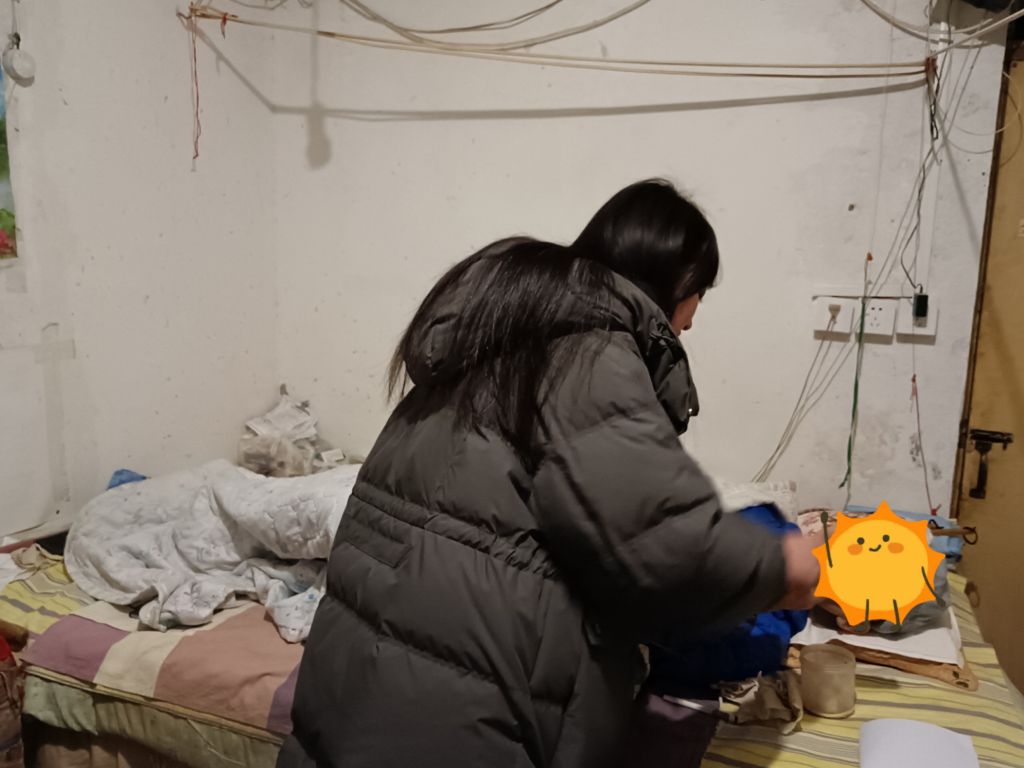 王老师因卧床无法看到房门,社会工作者将成品拍摄为照片拿到床头与服务对象一同欣赏,王老师看着新贴的对联,乐呵呵地说“春联写的是不是春天来了一派生机的意思?这春联一贴上就有过年的感觉了,谢谢你们一直想着我。”