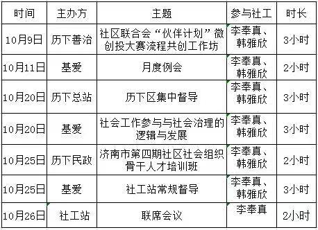 10月份,趵突泉街道社工站联合社区、社区志愿者、社会慈善资源等开展活动8次;1个社区社会组织参与社区服务与治理;链接5家社会资源,约计12000元,开展活动3场;开展困难群体帮扶活动1次;社工站全员参加督导培训7次,社工站站长参加联席会议1次,机构月度例会1次。