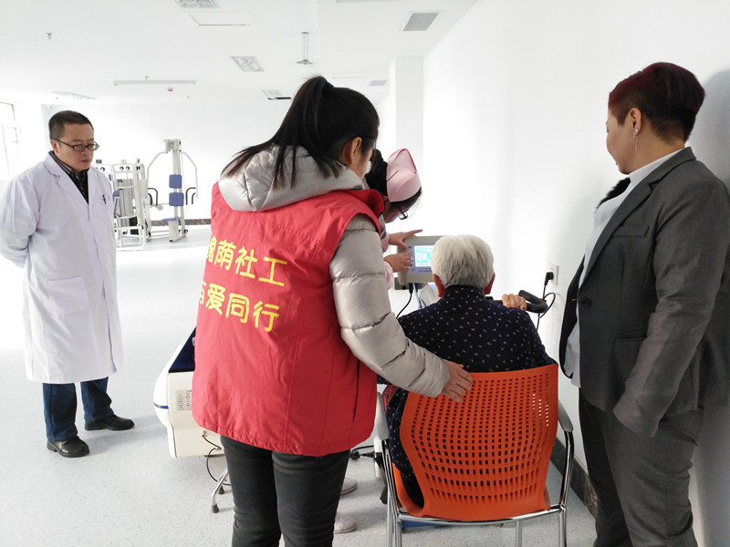 11月30日下午,福利中心项目组社工联合院内护士及护理人员充分利用福利中心专业的康复训练器材,为入住老人展开了一次康复训练活动。