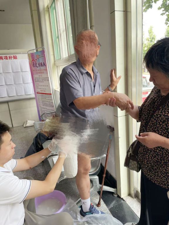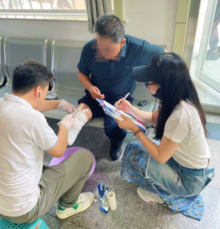 取模工作现场,埠村社工为其复印残疾证、身份证等准备工作,认真核对残疾人信息资料并进行登记。专业技师严格按照标准化流程,询问残疾人截肢原因,仔细检查、测量残肢,开展画图取样、适配取模等工作,力求做出适配度最高的假肢,确保假肢代偿功能得到最大限度发挥,让残疾人使用起来舒适方便。