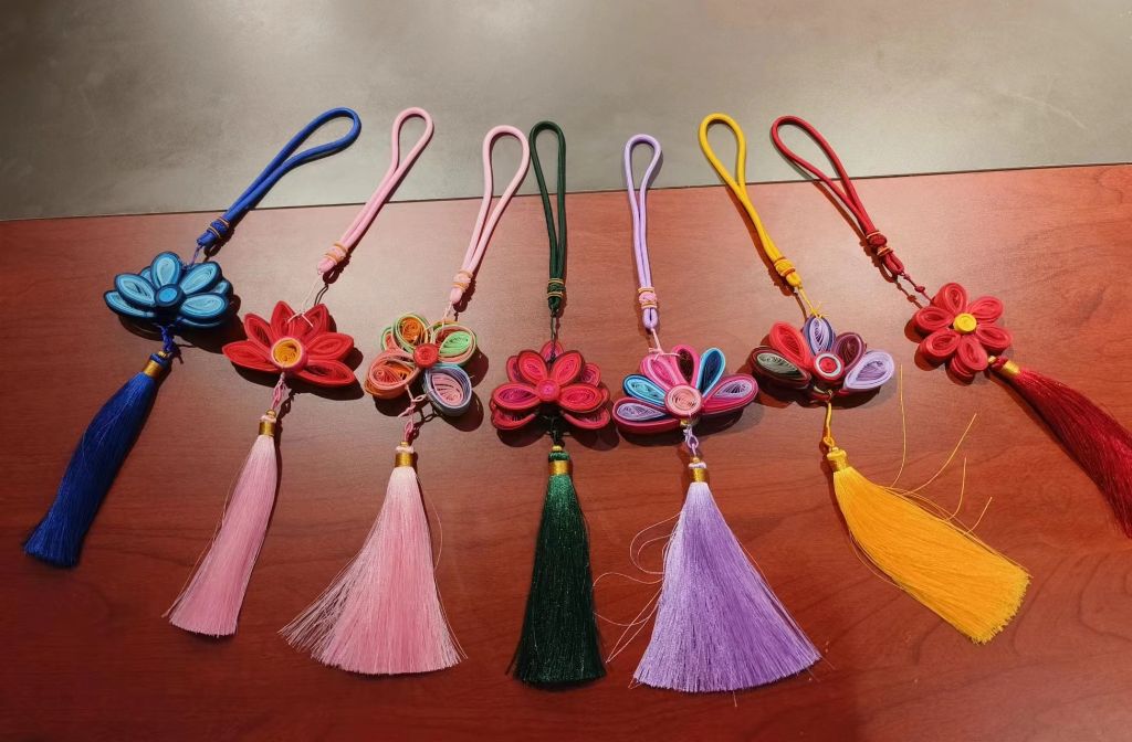 制作精美立体衍纸挂件。立体衍纸挂件作为衍纸主题小组活动进阶阶段,将整个主题活动的节奏带入高潮。社工展示立体衍纸挂件图样并耐心地演示制作步骤,带领小组成员制作出国风挂件作品。组员们运用前期积累的衍纸技巧,制作出扇形、荷花形、四叶草形等一个个精美巧妙的国风挂件,为此次“爱心造物社”手工小组——衍纸系列主题活动画上完美的句号。