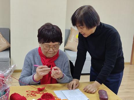 许久未见,早到的组员热切的招呼着刚来到的组员,大家在一起相互问好彼此夸赞,瞬间将距离拉近。紧接着,王老师带领大家重新回顾年前教授的钩织技巧,并欢迎新组员的加入,表示接下来的时间会继续教授大家不同的钩织手法,争取在这期小组结束时,大家能够齐心协力钩织一份成品留念。组员们也纷纷将春节假期在家钩织的小物件拿出来,钩织过程中遇到有疑问的地方与王老师一起认真探讨。一根小小的钩针,一条细细的毛线,上下翻飞间,钩织成万千的绚烂。“慧辛巧丝”老年手工编织小组虽然是2020年年末成立的康乐小组,但是发展迅速,组内基本已实现自助互助意识,稳固促进小组发展。