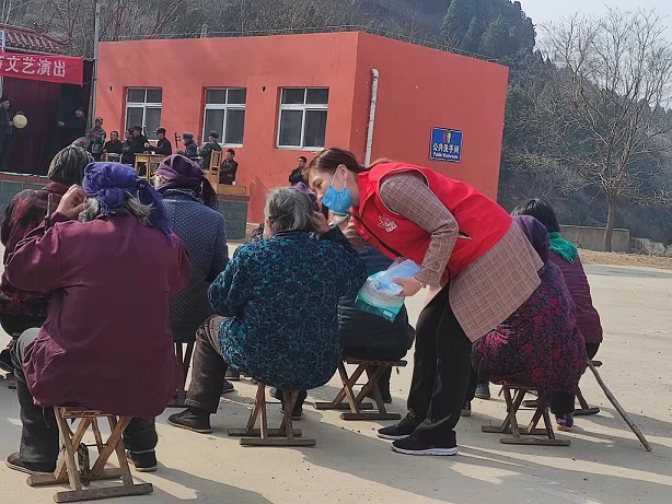来到北栾宫村广场,村内正在举办春节文艺演出活动,为注重疫情防控,社工站的社工们开始为老人分发口罩,并帮助老人们正确佩戴口罩,有些不方便的老人,社工便帮助其佩戴好口罩,并叮嘱他们疫情反复期间一定要随时注意自我防护。