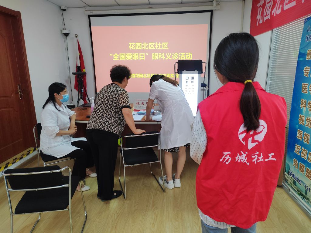 为进一步增强社区居民爱眼护眼意识,为居民提供更丰富、细致的健康服务,在第28个全国爱眼日来临之际,2023年6月6日下午,洪家楼街道社工站联合花园北区社区、洪家楼街道社区社会组织联合会,邀请山东中医药大学附属眼科医院眼视光诊所医务工作人员在花园北区社区居委会内开展以“关注普遍的眼健康”为主题的“全国爱眼日”眼科义诊活动,为辖区居民提供眼科基础检查及爱眼知识科普。