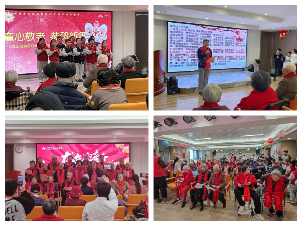 莫道桑榆晚,为霞尚满天。对老人的敬与爱,应不止于节日。我们应时时以弘扬中华民族传统美德,倡导尊老敬老风尚为荣,真正将关心老人,关爱长辈融入生活。新春即将到来之际,七里山街道社工站链接经五路小学青少年志愿者、海珀社区,举办了“童心敬老,恭贺新年”送福送温暖慰问演出活动,让老人感受到来自大家的关怀和温暖,大家在欢声笑语中感受中华传统美德的魅力。