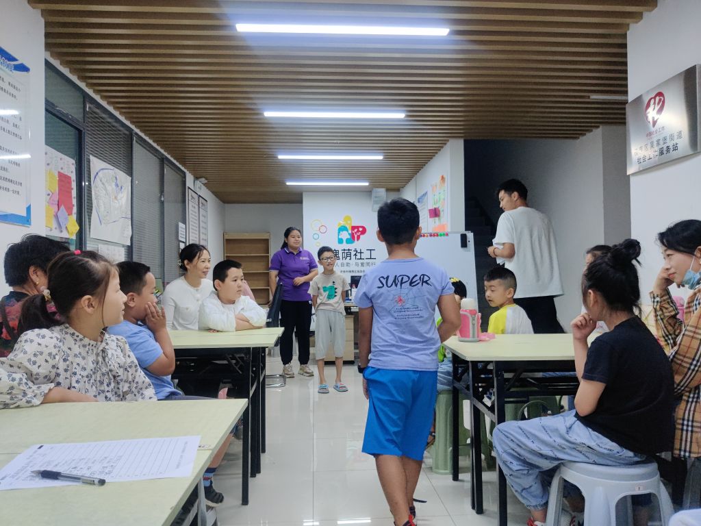 最后,也是整个活动中气氛最热烈的环节,社工组织组员一同拍摄了网络“忧乐”情景短视频。在此环节中,每位组员认真练习、积极排练,虽然起初排练时组员稍感困难,但通过社工的鼓励和引导,组员慢慢找到上台表演的感觉,并且每位组员在最终表演环节都表现得十分出彩,也得到了家长门的一致好评。