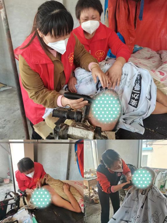 大扫除结束后,大家发现由于日夜照顾自己瘫痪在床的儿子,翟大爷无暇顾及自己的面貌状况,头发与胡须早已变得十分杂乱,社工和志愿者们同大爷商议过后,决定为其理发修理胡须,并帮助翟大爷的儿子也进行简单的修整。