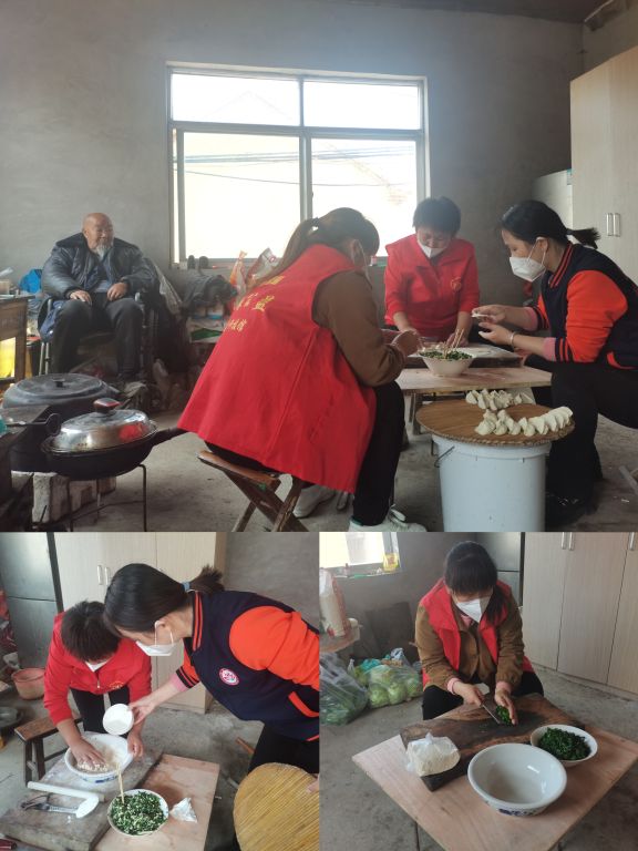 清理事宜完成时已临近中午,社工及志愿者们开始了包饺子行动,大家一起动手,大显身手,剁饺子馅、和面、擀皮、包饺子,在包水饺的过程中,社工与大爷聊着家常,现场其乐融融。