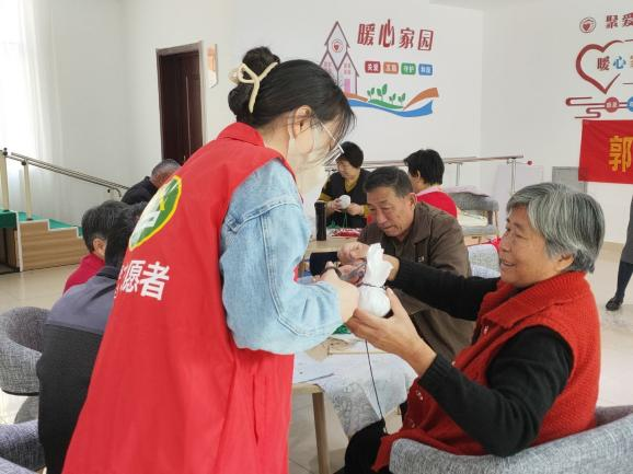 手工活动开始前,社工把布、艾草粉末、锤柄、麻绳、橡皮筋等制作材料逐一分发给大家,紧接着又向大家普及了艾草锤的功效和作用。制作过程中,老师一边讲解,一边动手演示,耐心仔细的讲解给老人,大家也紧跟老师的步伐,把蓝色粗布平摊在桌面、艾草粉末倒入粗布正中间捏成一个紧实的圆形……在轻松愉快的氛围中,在社工和志愿者的协助下,一个个形似话筒的养生锤便制作完成了。活动结束后郭店街道社工对老人们进行血压、血糖的测量,提醒高血压、高血糖老人注意身体健康事项。通过本次活动,让社区的老人们在日常生活的同时感受到了社会大家庭的温暖,增进了彼此之间的情感交流。