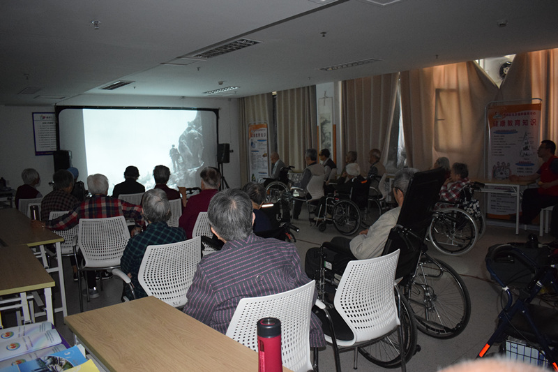 为了丰富住养老人的精神文化生活,让住养老人能走出房门,感受院舍化生活。5月22日,悦银龄养老社工项目组链接省广电资源,为住养老人在三楼老年大学活动室放映电影《上甘岭》,共有27位老人参加。